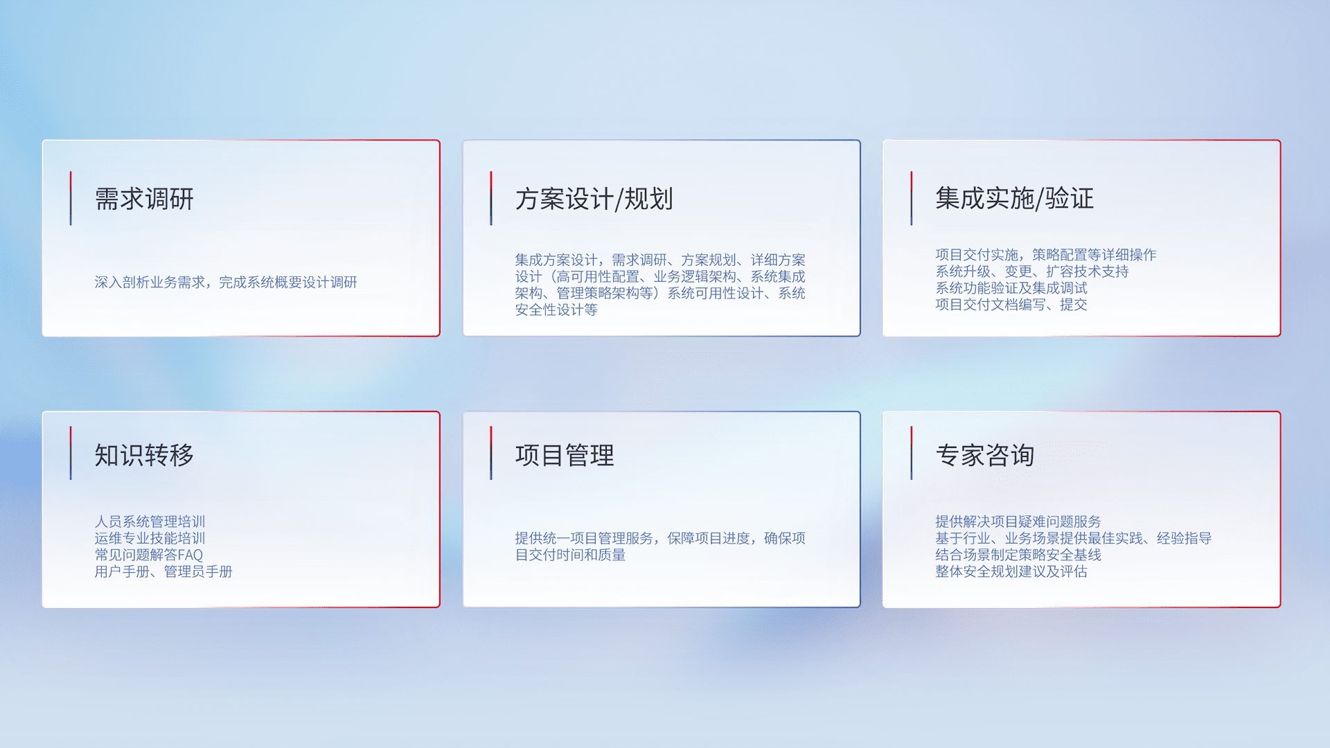 针对客户行业特性,,,,将宏观的安全战略和需求,,,,通过专业的交付服务,,实现项目落地,,,,为客户提供标准规范的集成交付服务。。